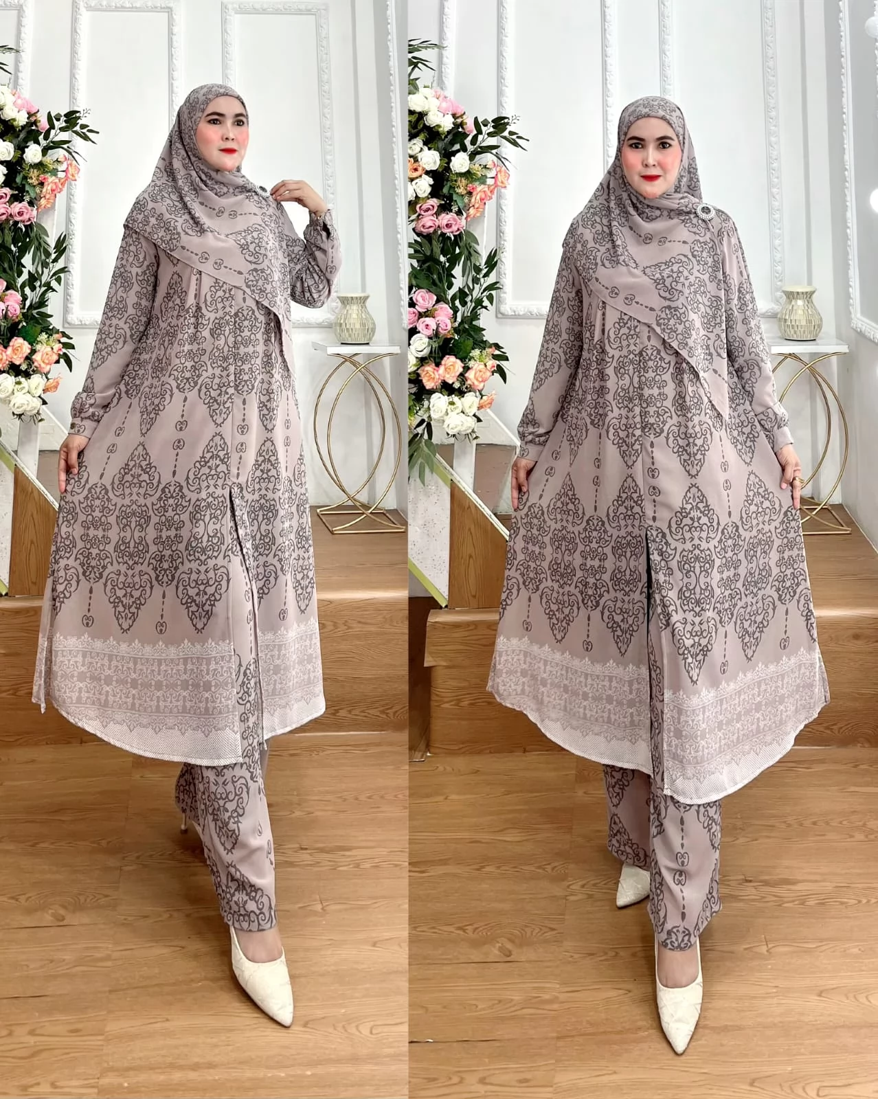 بِسْمِ اللَّهِ الرَّحْمَنِ الرَّحِيم 💍 Alika d'series, merek ZC syari by Charissa syari, membawa koleksi terbaru dengan bahan Babydol Motif Etnic Printing yang membuat Anda tampil anggun dan nyaman. Setelan ini termasuk celana dan jilbab segi 4, dirancang dengan berbagai fitur unggulan.